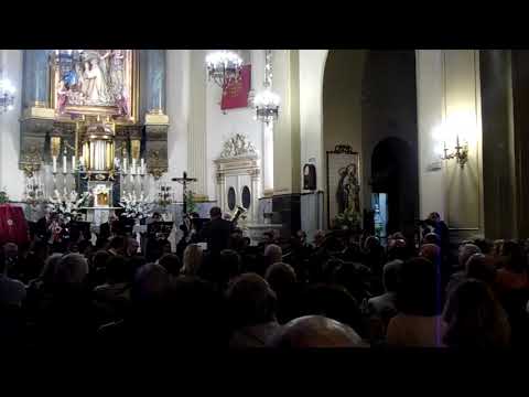 La Banda de Música Agapito Verdeguer de Madrid, en la Parroquia de San Ildefonso y de los Santos Niños Justo y Pastor de Madrid sede canónica de la Muy Ilustre Hermandad Sacramental y Penitencial Cofradía de Nazarenos de Nuestro Padre Jesús del Amor en su Sagrada Entrada Triunfal en Jerusalén, María Santísima de la Anunciación y Nuestra Señora del Rosario y Patriarca Glorioso y Bendito Señor San José, vulgo "La Borriquita" interpretando la marcha El Evangelista del compositor José Vélez García
